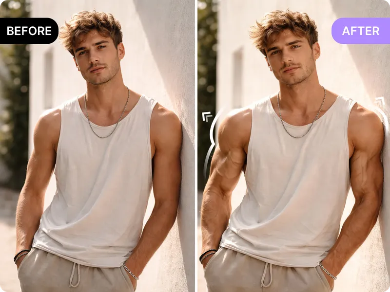 Add sharper muscle definition to arms, abs, or glutes with the muscle-up tool. Keep natural lighting and expression while highlighting the areas you want to emphasize.